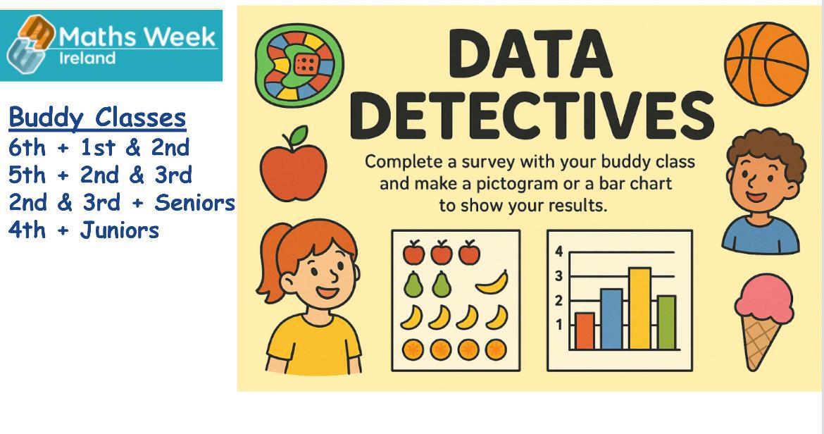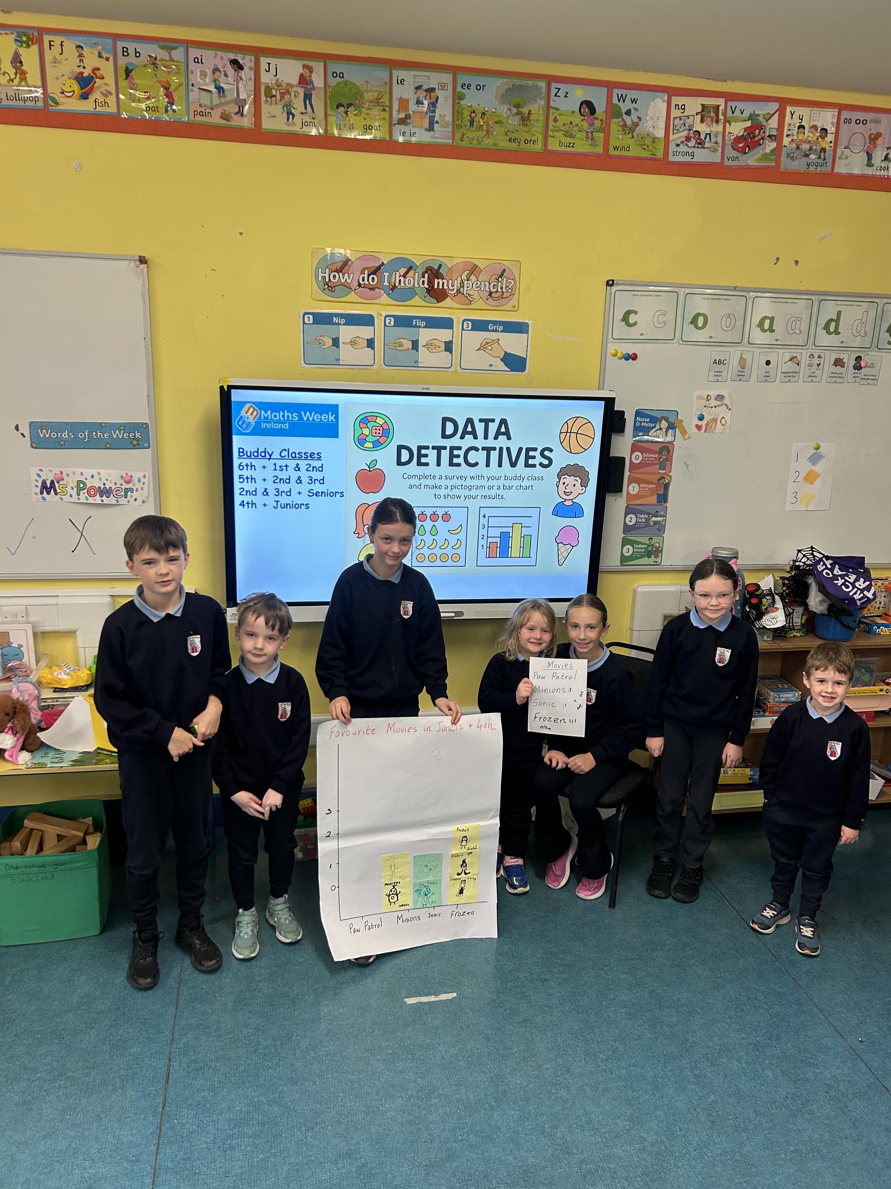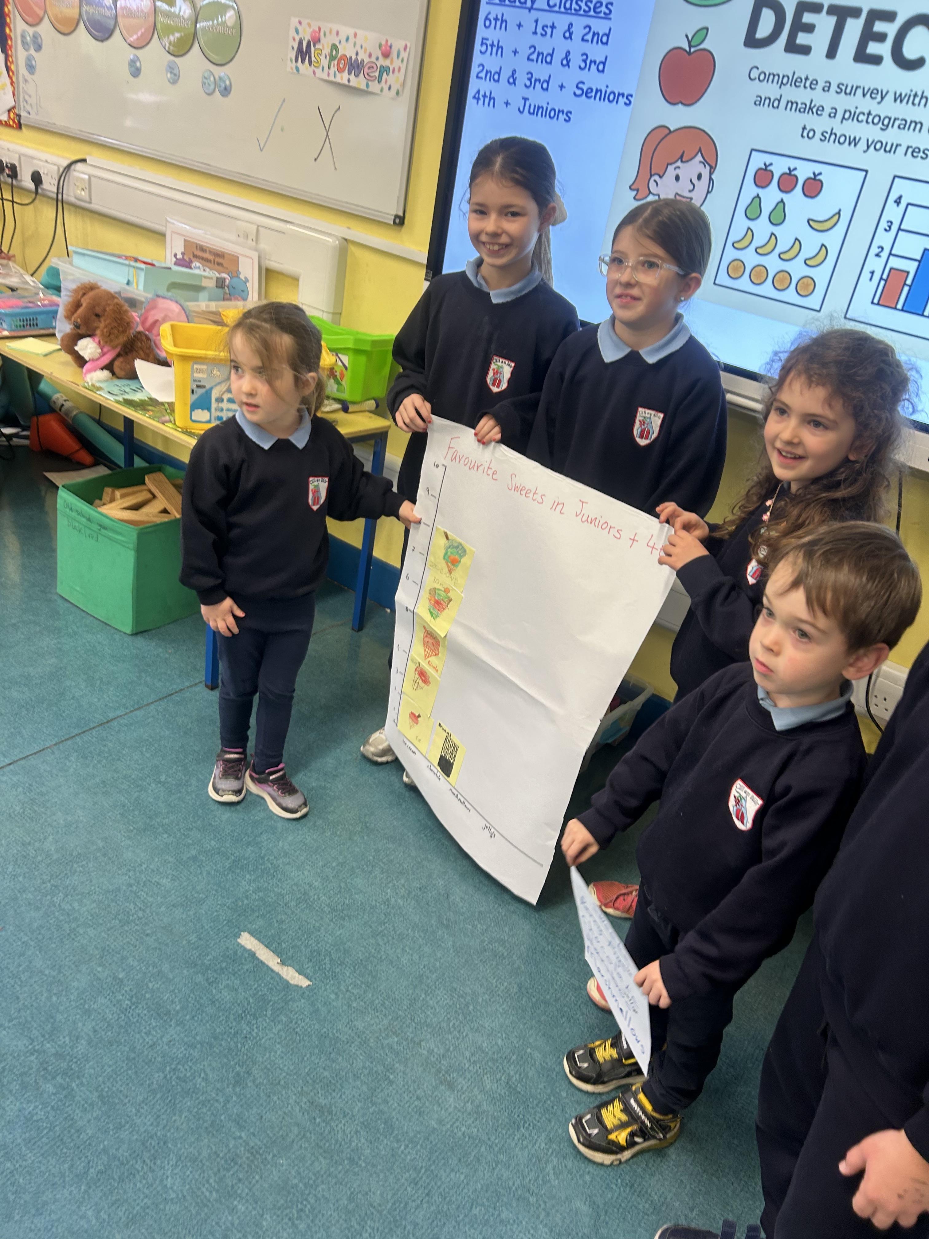 On Wednesaday we became Data Detectives with our 4th Class buddies! We did a vote with our buddies to see what our favourite animals, sweets, games and movies were. Then our class buddies helped us to create a pictogram and juniors presented the findings in front of our class! 😀