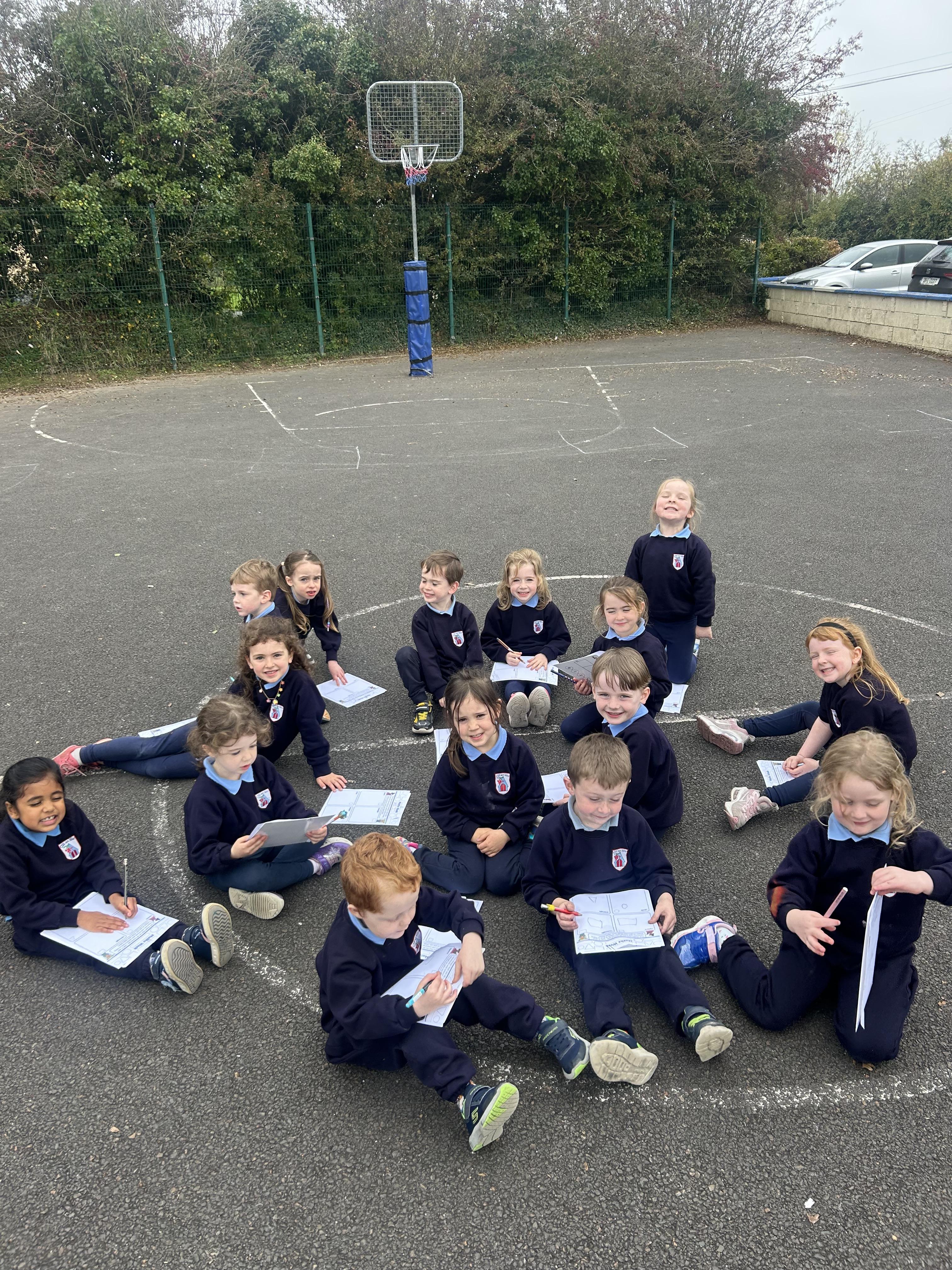 On Tuesday, our class were broken into 4 teams and joined up with Seniors and first class to complete to Maths Movment games and activities. We focussed on colours, patterns and using 2D shapes. Skills such as working as part of a team, turn taking and problem solving were also used during our 4 activities with the different class teachers.